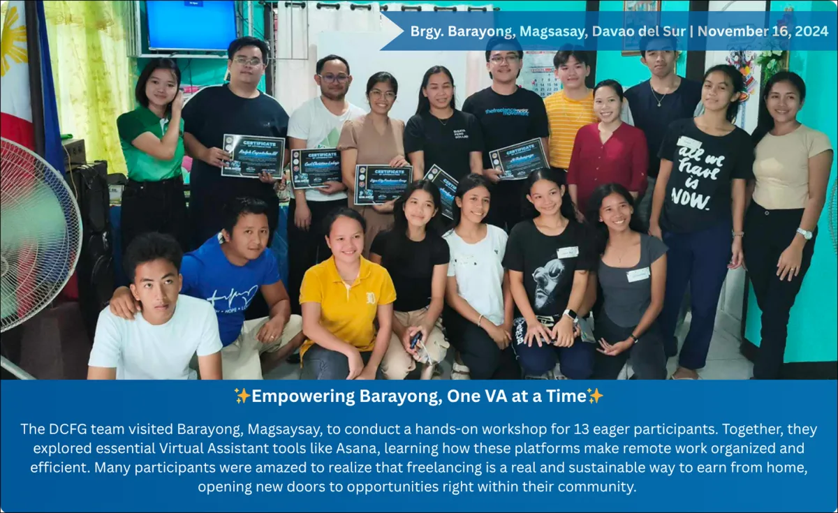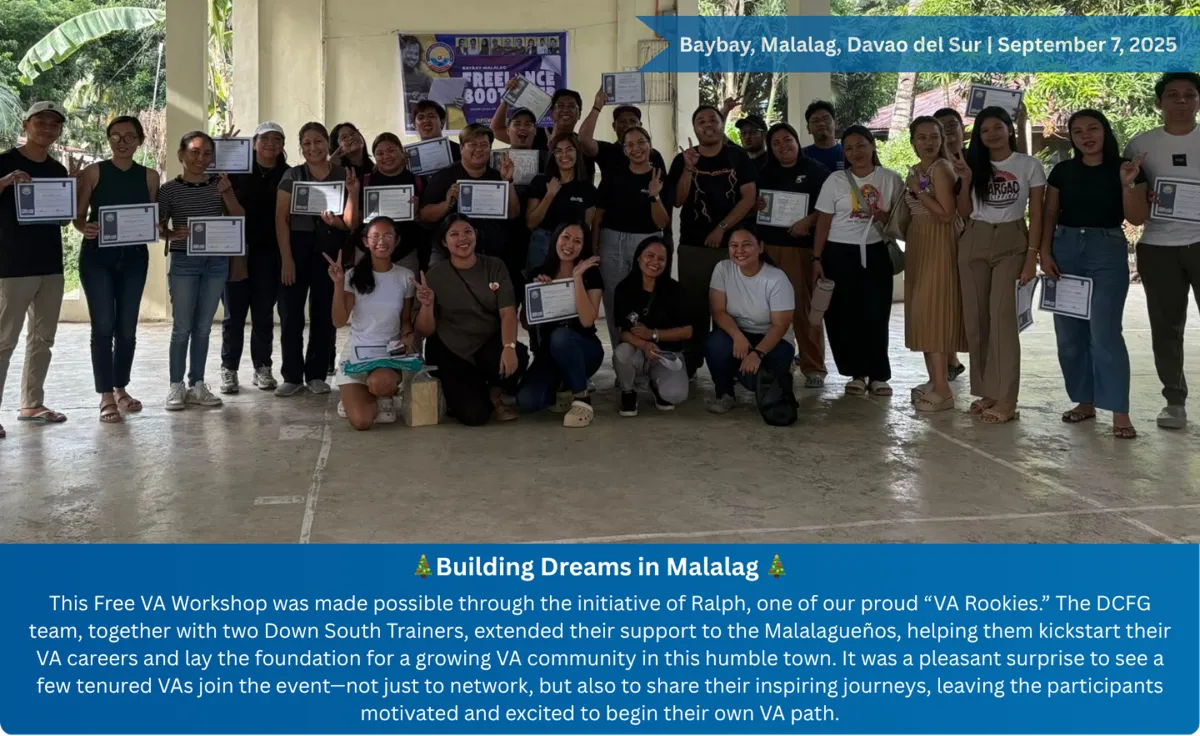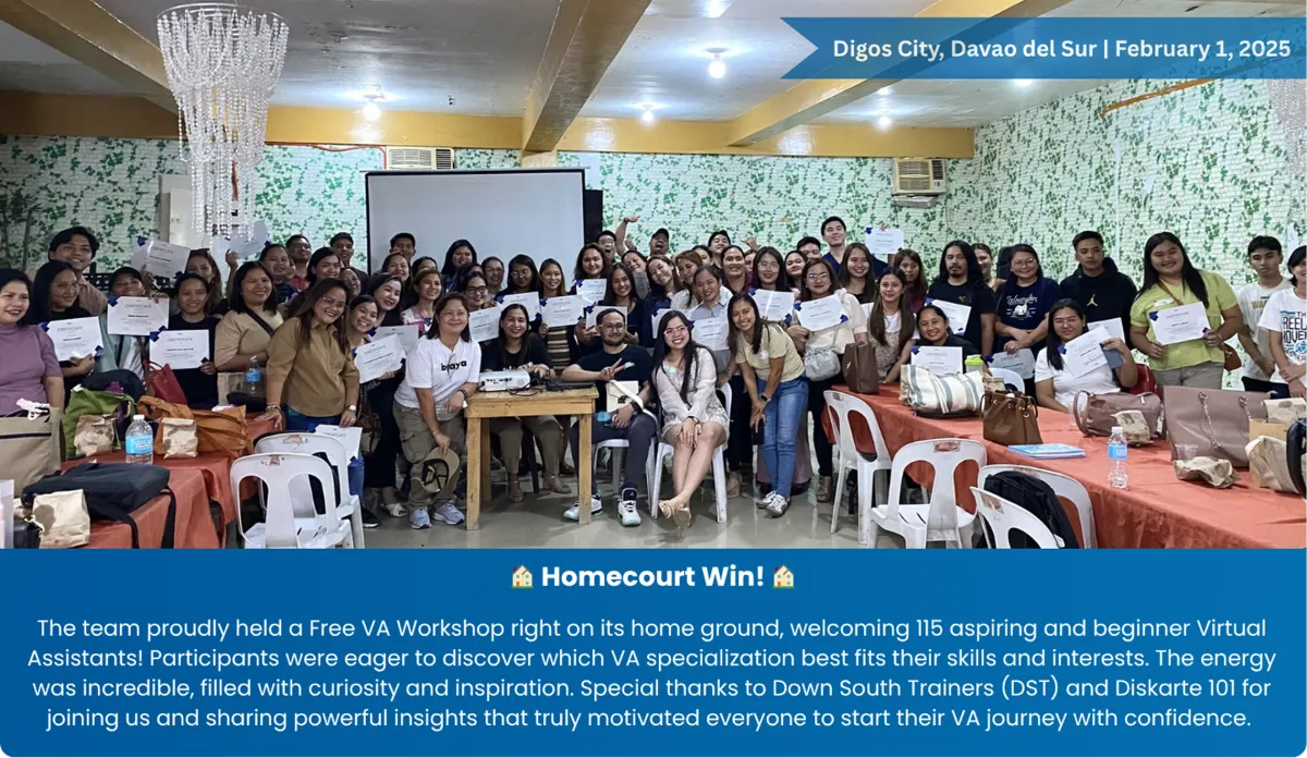 A group of dedicated freelancers from Digos City, Davao del Sur, committed to helping others start and grow their freelancing careers. Through workshops, mentoring, and community support, we aim to empower aspiring VAs and freelancers to achieve freedom and success.
